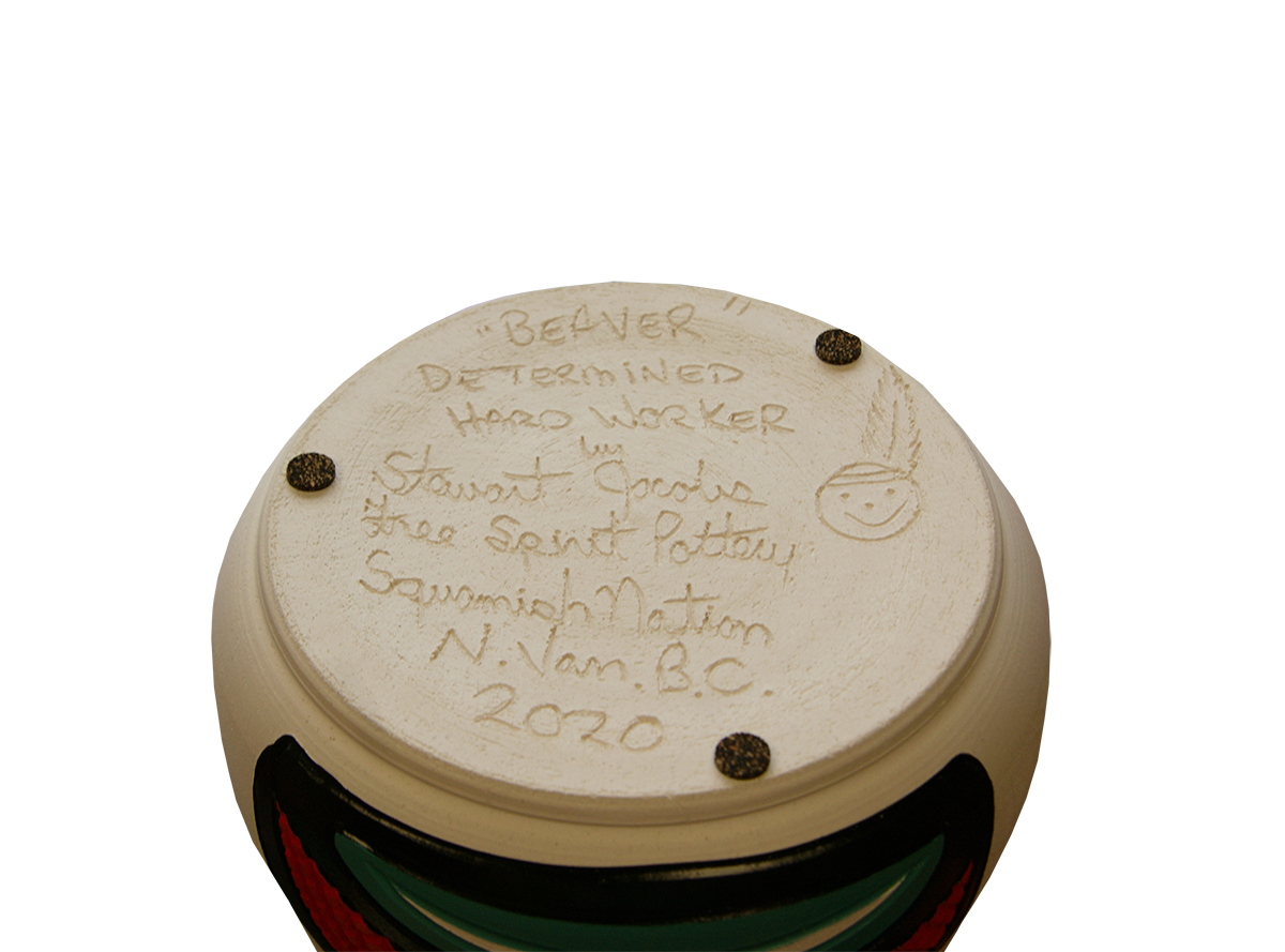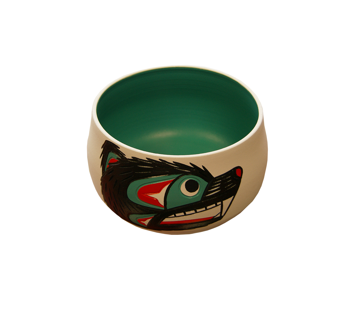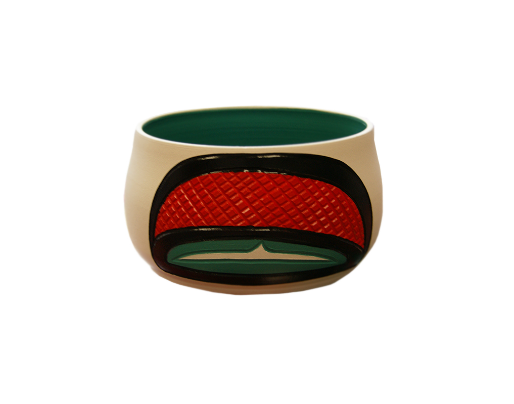 This master artist carves all the designs into the ceramic and uses brilliant paints to finish his pieces. This bowl shows a beaver face and crosshatched tail painted in turquoise, red and black, it compliments the soft white background beautifully.